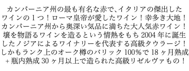 カンパーニア州の最も有名な赤で、イタリアの傑出したワインの1つ!ローマ皇帝が愛したワイン!幸多き大地!カンパーニア州から奥深い気品に満ちた大人気赤ワイン!壌を物語るワインを造るという情熱をもち2004年に誕生したノジアによるワイナリーを代表する高級タウラージ!しかもランク上のオーク樽のバリック100%で18ヶ月熟成+瓶内熟成30ヶ月以上で造られた高級リゼルヴァもの!