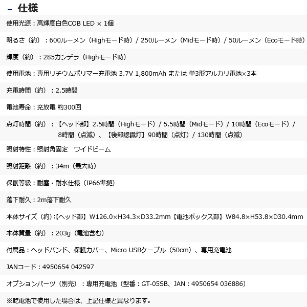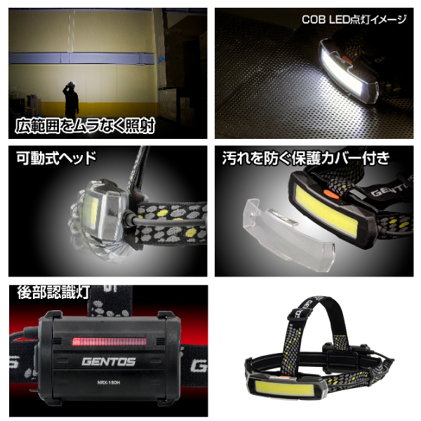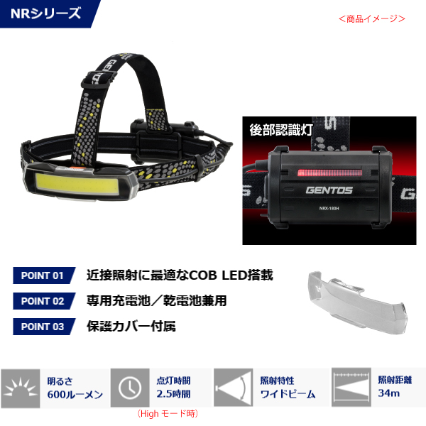 ジェントス NRX-180H ハイブリッド式ヘッドライト NRシリーズ 近接照射に最適なCOB LED 専用充電池・乾電池(別売)兼用 後部認識灯搭載 脱着可能な保護カバー付き