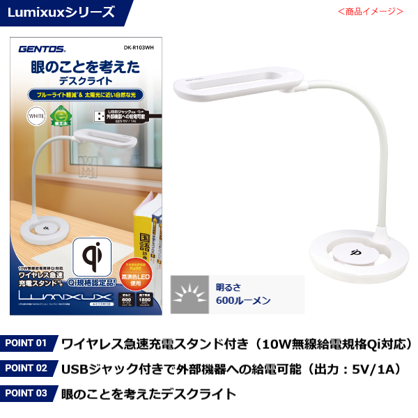 ジェントス Lumixux(ルミサス)シリーズ デスクライト DK-R103WH 600ルーメン AC電源 ワイヤレス急速充電スタンド(Qi)搭載 USBジャック付き スマホスタンド付き 眼のことを考えたデスクライト