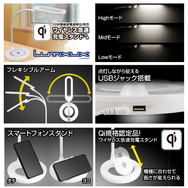 ジェントス DK-R103WH デスクライト ホワイト Lumixux(ルミサス)シリーズ プッシュスイッチ ワイヤレス急速充電スタンド付き スマホスタンド USBジャック搭載