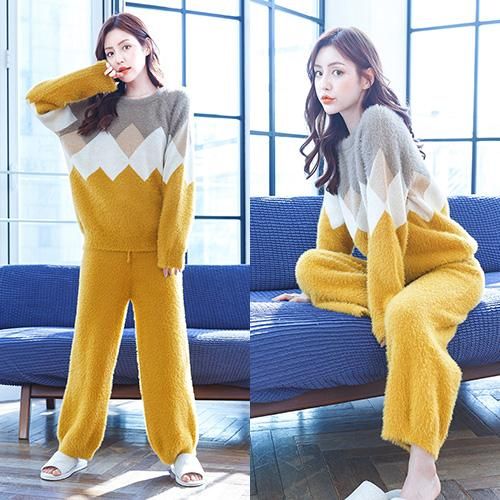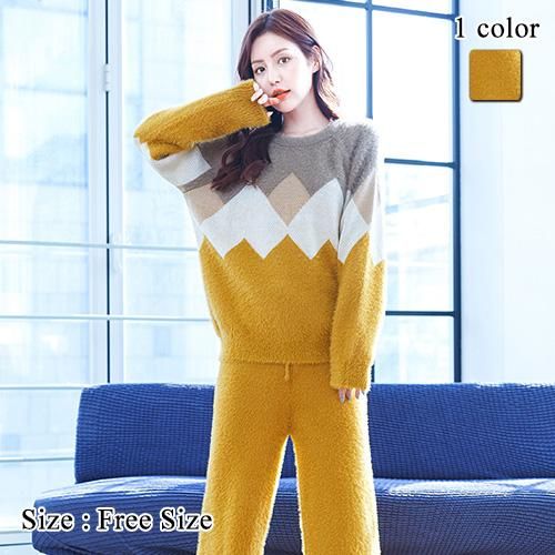 アーガイル柄風がチャーミングなふわもこスタイルのルームウェア(ROOMWEAR)。