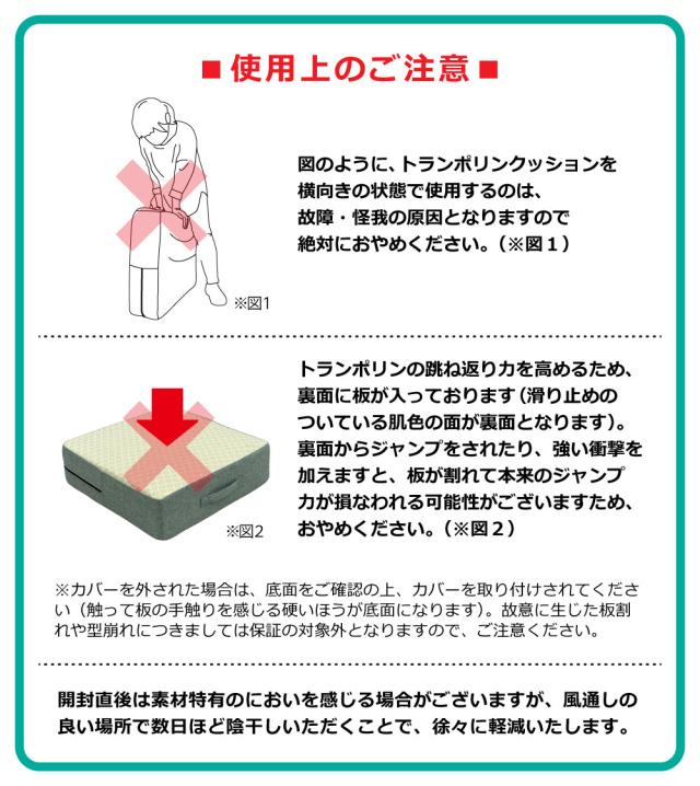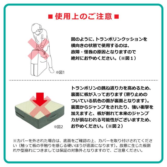 トランポリンの跳ね返り力を高めるため、裏面に板が入っております(滑り止めのついている肌色の面が裏面となります)。裏面からジャンプをされたり、強い衝撃を加えますと、板が割れて本来のジャンプ力が損なわれる可能性がございますため、おやめください。