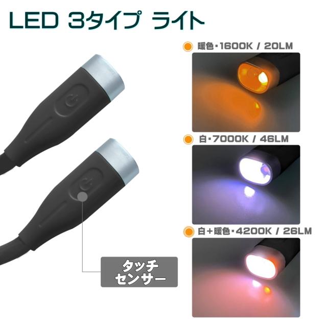 軽く触れるだけで電源ON/白色LED/暖色LED/白+暖色LED/OFFと変更できます。