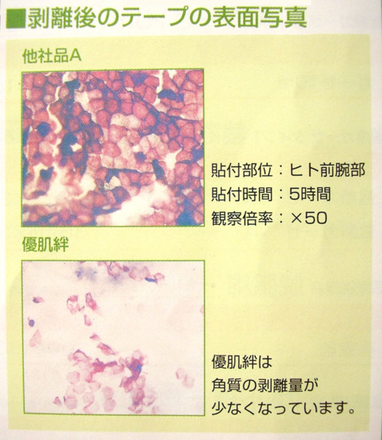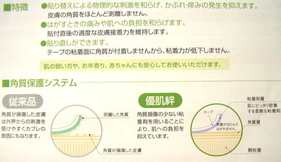 優肌絆の粘着剤は柔らかいゲルタイプで、従来のテープにはなかったものです。皮膚の凸凹にぴったりとなじんで皮膚によく密着するため、粘着力は従来のままに、しかも剥がす時に角質層を剥離・損傷しません。 何度も同じ場所に使用する方、人工透析を受けている方、従来のテープでお困りの方にぜひお試しください。 特長 ●角質層をほとんど剥離せず、貼り替えによる刺激を和らげます。 ●粘着面に角質層が付着しませんので、粘着力が低下しません。 ●手で容易にカットできます。 ※取り寄せの場合3日〜1週間ほどお時間を頂きます