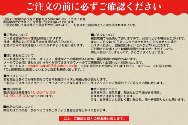 | ●サイズ詳細等の測り方はスタッフ間で統一、徹底はしておりますが、実寸は商品によって若干の誤差(1cm〜3cm )がある場合がございますので、予めご了承ください。 ●製造ロットにより、細部形状の違いや、同色でも色味に多少の誤差が生じます。 ●パッケージは改良のため予告なく仕様を変更する場合があります。 ▼商品の色は、撮影時の光や、お客様のモニターの色具合などにより、実際の商品と異なる場合がございます。あらかじめ、ご了承ください。 ▼生地の特性上、やや匂いが強く感じられるものもございます。数日のご使用や陰干しなどで気になる匂いはほとんど感じられなくなります。 ▼同じ商品でも生産時期により形やサイズ、カラーに多少の誤差が生じる場合もございます。 ▼他店舗でも在庫を共有して販売をしている為、受注後欠品となる場合もございます。予め、ご了承お願い申し上げます。 ▼出荷前に全て検品を行っておりますが、万が一商品に不具合があった場合は、お問い合わせフォームまたはメールよりご連絡頂けます様お願い申し上げます。速やかに対応致しますのでご安心ください。 | |