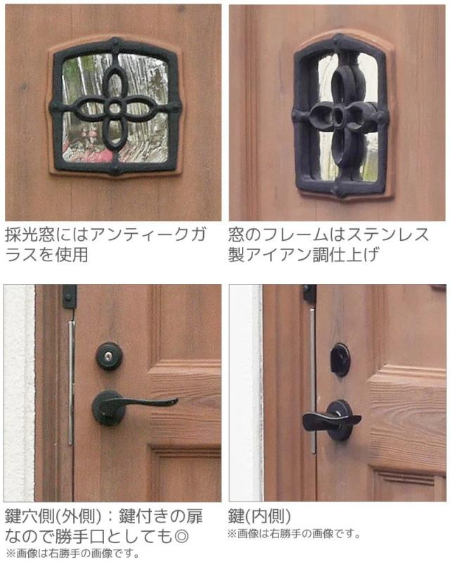 アンティークガラスのはいった小窓にステンレス製アイアン風仕上げの枠組み。錆びないので安心です。扉はラッチ錠による施錠機能付きなので勝手口としてもつかえます。