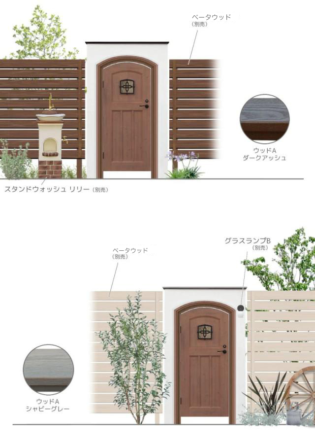 <左勝手>ウッドA ダークアッシュ DPRFL01、ウッドA シャビーグレー DPRFL02、瓦A イエロー DPRFL03、瓦A ブラウン DPRFL04