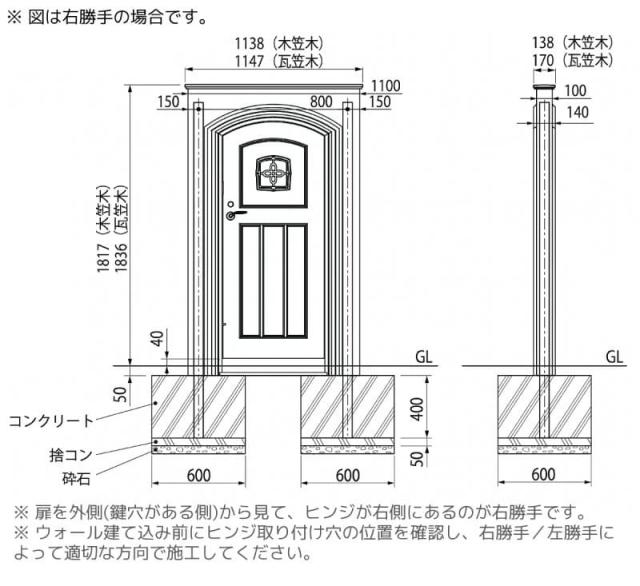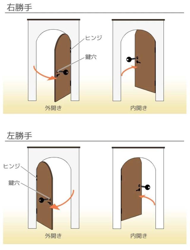 扉を外側(鍵穴がある側)から見て、ヒンジが右側 → 右勝手、ヒンジが左側 → 左勝手です。