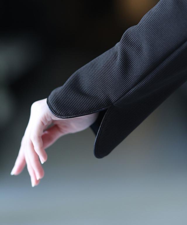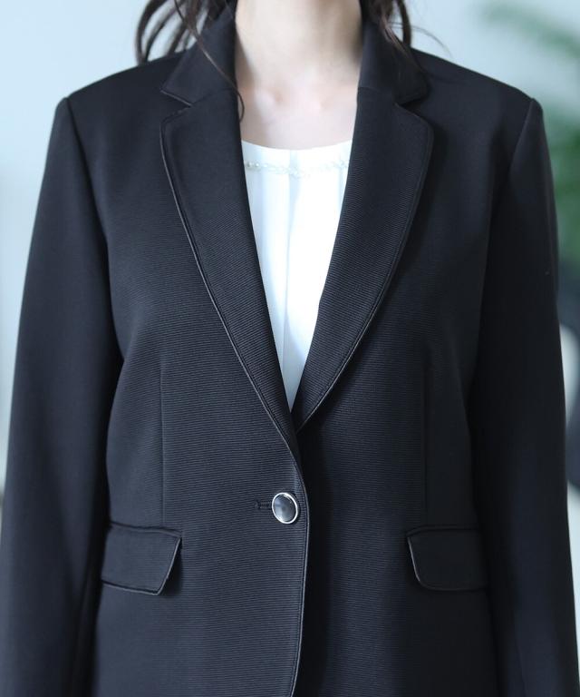 ノーカラーJKにはフロントホック部分にビジューが付いており華やかさをプラス