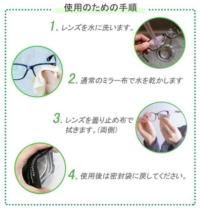 ※水分の拭き取りには適しておりません。水に濡れると曇り止め成分が溶け出し、 使用可能回数が少なくなります。