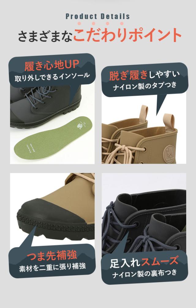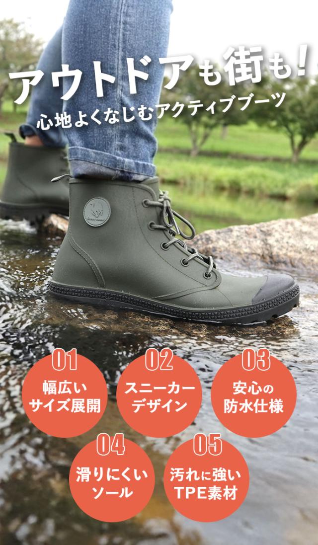 | 商品説明 | ・川でも、山でも、街でも!Green camelから、どこでも馴染むアクティブブーツの登場♪ ・アウトドアから、タウンユースまで、幅広く着用可能で、様々なファッションに合う♪ ・表面素材には、軽く丈夫でしなやかなTPEを使用。擦り傷等に強く、ゴムのようにしなやか。 ・アウトソールはタイルなどでも滑りにくいパターンを採用しており、底から高さ7cmくらいまで完全防水仕様! ・インナーは、足入れをスムーズにするナイロン製の裏地付きで履きやすい。 ・クッション性のあるインソールは疲れにくく、快適な履き心地。 ・女性も男性も履けちゃう、アクティブレインブーツ! |