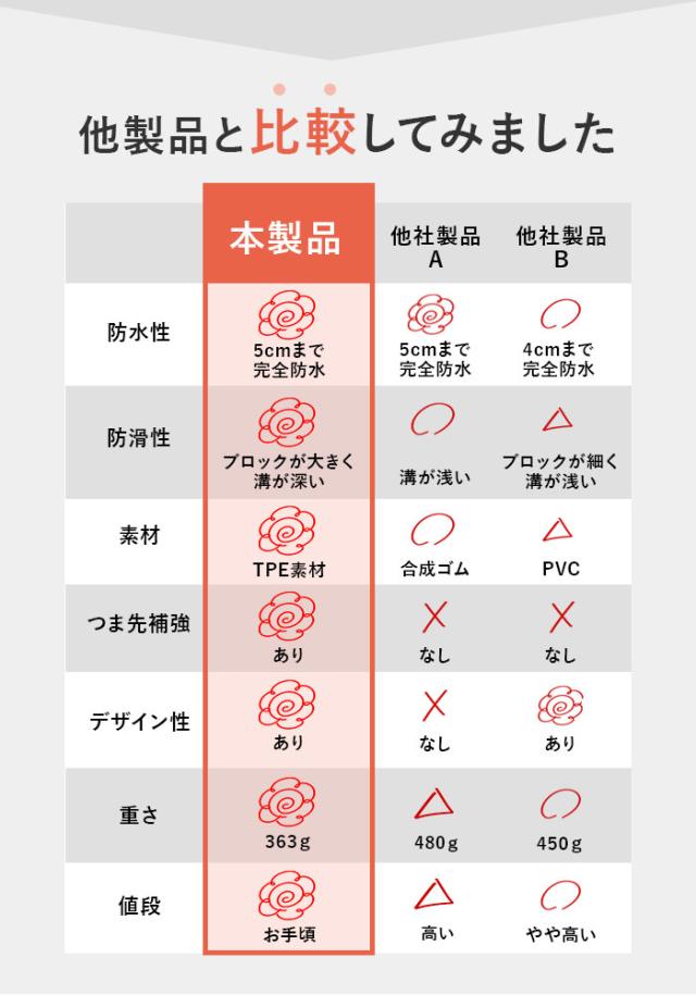 | 注意点 | ※変形(ゆがみ・縮み)、軟化を防ぐ為、火のそば、車中、ベランダ、直射日光が当たる場所等、高温になる恐れのある所に放置しないようご注意ください。 ※履き物は足のサイズに合ったものをご使用ください。足に合わない靴を履くと足を痛める原因になります。また使用場所によっては危険を招く恐れがあります。 ※防水スプレーなどの有機溶剤のご使用はおやめください。商品の劣化または変形を招きます。 ※靴底が摩耗している場合は滑りやすく、事故につながる恐れがあります。ご使用前に必ずご点検ください。 ※油の上、濡れている床、砂の散らばっているコンクリートや硬い石の上などは、滑りやすいのでご使用にならないことをお勧めします。 ※体質によっては、カブレ、発疹、カユミなどを起こす場合があります。このような症状を感じた場合は直ちにご使用をおやめください。 ※製品の特性上履き口部分が地肌に擦れる場合があります。ご使用される際は履き口部分が当たらないほどの丈のソックスをお履きいただくことをおすすめします。 ※特殊な用途にご使用の場合は専用の靴がありますので、それぞれの用途にあった靴を選んでください。 ※鋭利なものは貫通する恐れがあります。また安全靴ではありませんので、竹藪など危険な場所での使用はしないでください。 ※汚れを取る場合は、まず汚れをよく落とし、真水で丁寧に洗ってください。また変形を防ぐ為高温での洗浄や乾燥はお避けください。 ※乾燥、保管される場合は、日陰で乾かし、日の当たらない冷暗所で保管してください。 ※PVC商品には素材特有のにおいがしますが、徐々に軽減いたします。風通しの良い冷暗所で保管してください。 ※染色の特性上、色落ちする場合があります。生地の摩擦で他の衣料に色が移ることがありますのでご注意ください。また、汗をかいたり雨にぬれた時など水分を含んだ状態も色落ちの原因となります。 ※カメラやモニターの性質により、画像と実物の色の違いがある場合がございますのでご理解願います。 |