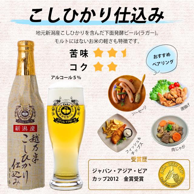 | 度数 | アルコール度数:5%(エール、感謝エール、アンバー、こしひかり・岩室こしひかり、ヴァイツェン)・6%(ポーター) |