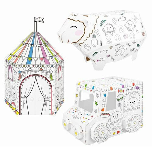 組み立てて色を塗れる、子供に大人気の組み立て立体塗り絵シリーズ。羊・お家・車の3種類を紙工作で作ります。