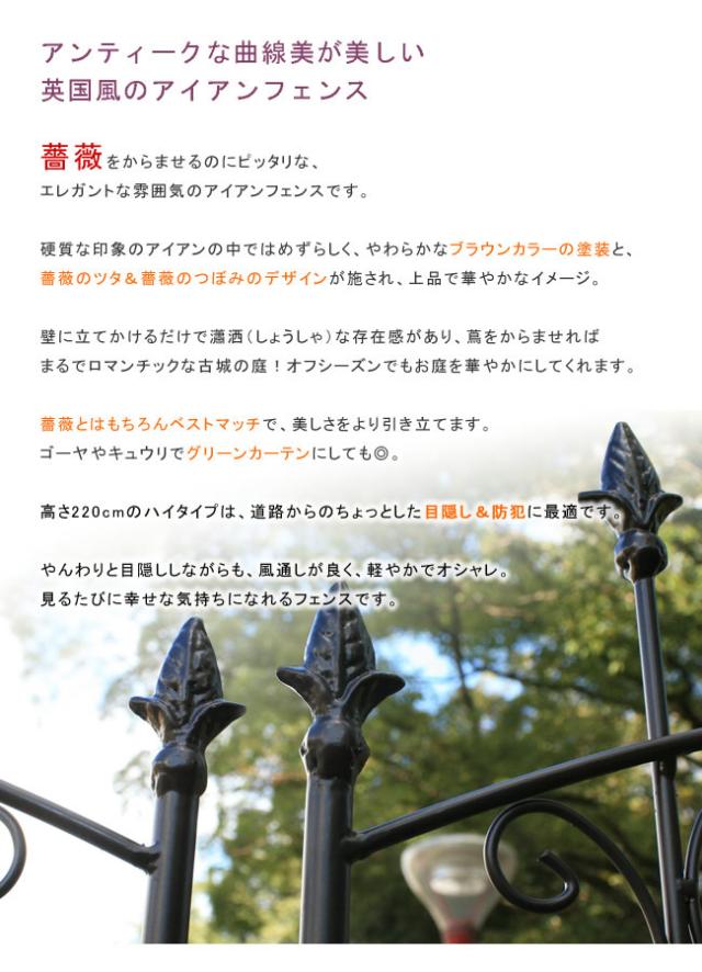 | 説明 | アンティークな曲線美が美しい、英国風のアイアンフェンス 薔薇をからませるのにピッタリ! エレガントな雰囲気のアイアンフェンスです。 硬質な印象のアイアンの中ではめずらしく、やわらかなブラウンカラーの塗装と、 薔薇のツタ&薔薇のつぼみのデザインが施され、上品で華やかなイメージ。 壁に立てかけるだけで瀟洒(しょうしゃ)な存在感があり、蔦をからませれば まるでロマンチックな古城の庭!オフシーズンでもお庭を華やかにしてくれます。 薔薇とはもちろんベストマッチで、美しさをより引き立てます。 ゴーヤやキュウリでグリーンカーテンにしても◎。 高さ220cmのハイタイプは、道路からのちょっとした目隠し&防犯に最適です。 やんわりと目隠ししながらも、風通しが良く、軽やかでオシャレ。 見るたびに幸せな気持ちになれるフェンスです。 |