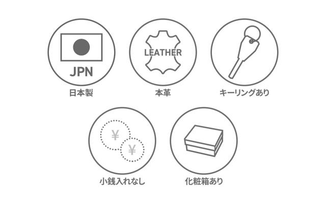 | 仕様 | <外側> ジップポケット(S)×1 └ 内蔵 仕切り×1 ジップポケット(S)×1 └ 内蔵 ポケット(S)×1 キーチェーン×1 <内側> 札入れ×1 ポケット(S)×3 |