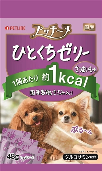ひとくちサイズの便利なおやつ。ワンちゃんの大好きな国産若鶏ささみと、ワンちゃんの大好きな国産若鶏ささみと、さつまいもをブレンドしたぷる〜んとおいしいゼリータイプ。関節の健康維持にグルコサミンを配合。1個あたり約1kcalのお手軽おやつです。