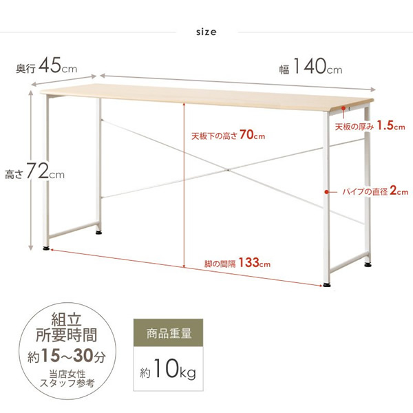 手軽に使えてどんな部屋にも馴染むをコンセプトに生まれた、 シンプルデザインデスク「ブラン」。 ワンルームや一人暮らしなどの手狭なお部屋でも場所を取らずすっきり。 ■サイズ: 本体:幅140×奥行45×高さ72cm ■材質: 天板:プリント紙化粧繊維板 フレーム:スチール、粉体塗装 ■商品重量: 約10kg ■耐荷重: 天板:約10kg ■仕様: アジャスター付き お客様組立品 ※写真に写ってる小物等は付属致しません。 ※写真はメーカー様のカタログ等から掲載させて頂いております。 実物の商品と写真の色が若干写真写り等により異なる場合がありますのでご注意くださいませ。 万が一の際でございましても返品はお受け致しかねます。 お客様組立て品につきましては、組み立て後に不良の連絡をされても対応ができません。 組み立て前にパーツに不良・傷等がないか、必ずご確認下さいます様よろしくお願い申し上げます。 ※記載は商品仕様の一部です。仕様説明不足等の理由での返品はできません。特に適合等は必ずご確認ください。