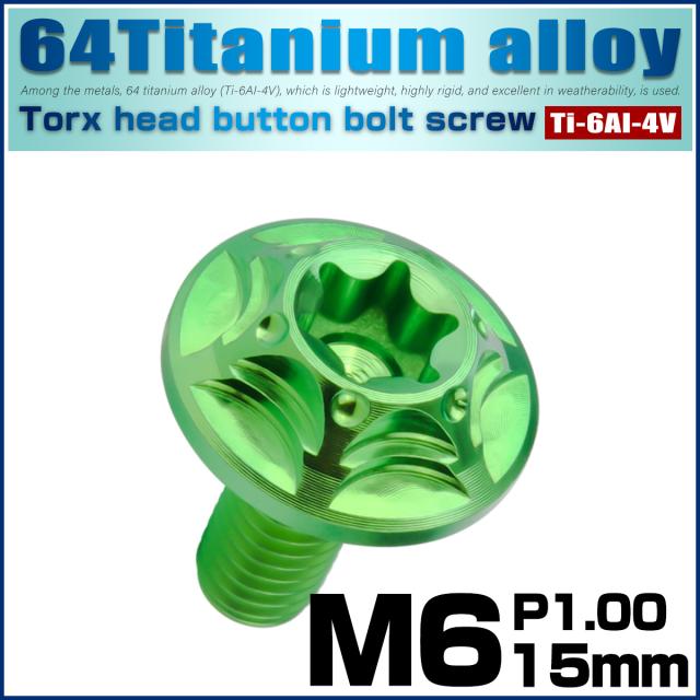 チタンボルト M6×15mm P1.0 ボタンボルト フランジ付き トルクス穴 グリーン JA1032
