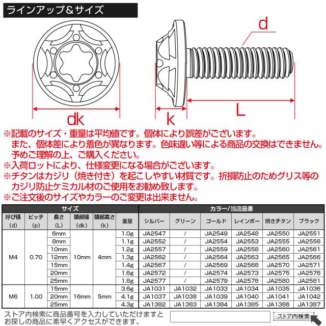 チタンボルト M6×15mm P1.0 ボタンボルト フランジ付き トルクス穴 レインボー JA1034