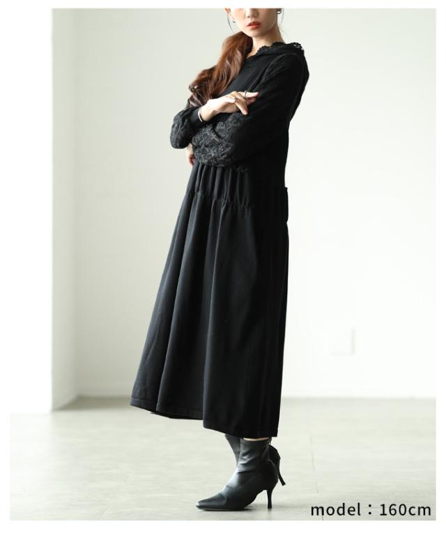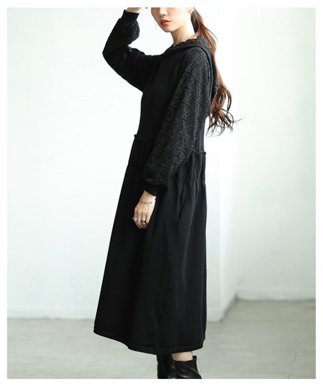 冬新作 花刺繍レースフードのニットフレアワンピース レディース ファッション ワンピース ニット 黒 ブラック 長袖 ミモレ丈 大人可愛い 40代 レディースファッション 50代女性 ファッション 60代 ミセスファッション サワアラモード sawa a la mode otona mode-7442