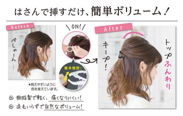ちょこっとするだけで“パッ”と垢抜け! はさんで挿すだけ、トップにボリューム! 簡単開閉のバレッタで逆毛いらずのふんわりトップ!