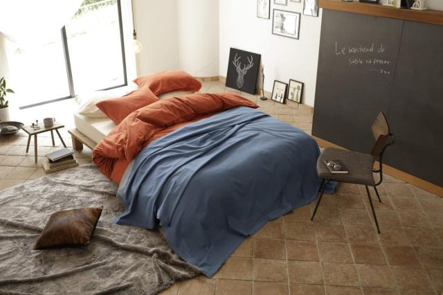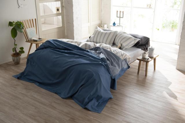 大きなサイズのベッドリネンは接ぎ目が入っていることが多いですが、Fab the Homeでは広い生地幅を生かし、肌に触れる部分に接ぎ目がない仕様に仕上げています。上品で落ち着いた色合いのネイビーと、カジュアルで明るい色合いのブルーの2色展開です。