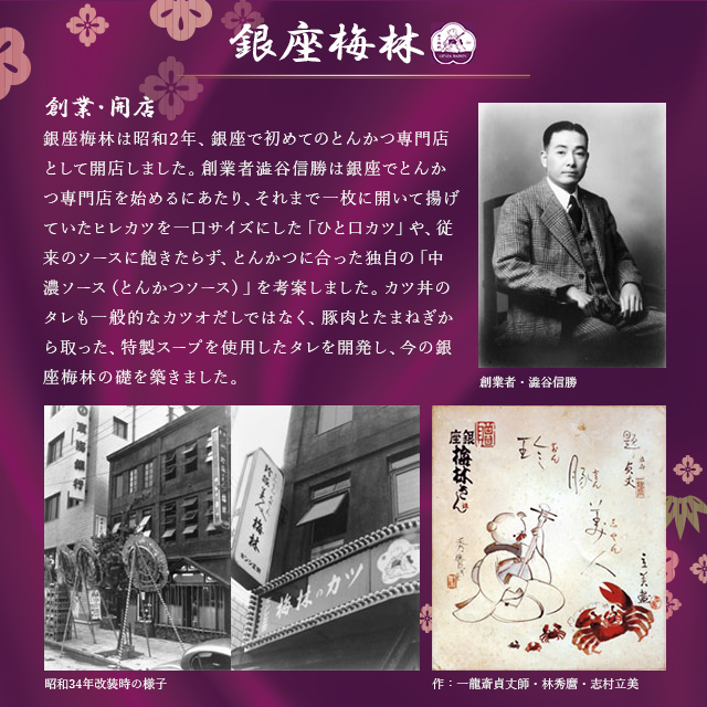 銀座梅林は、昭和2年(1927年)に創業開店した、東京・銀座で初めてのとんかつ専門店です。創業者の澁谷信勝は、銀座でとんかつ専門店を始めるにあたり、それまで1枚に開いて揚げていたヒレカツをひとくちサイズに。さらに従来のソースに飽き足らず、よりとんかつに合う独自の中濃とんかつソースを考案しました。