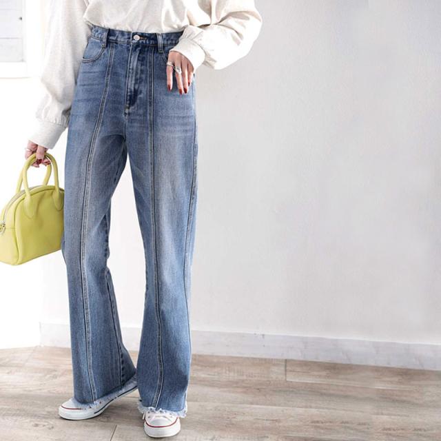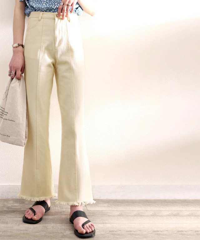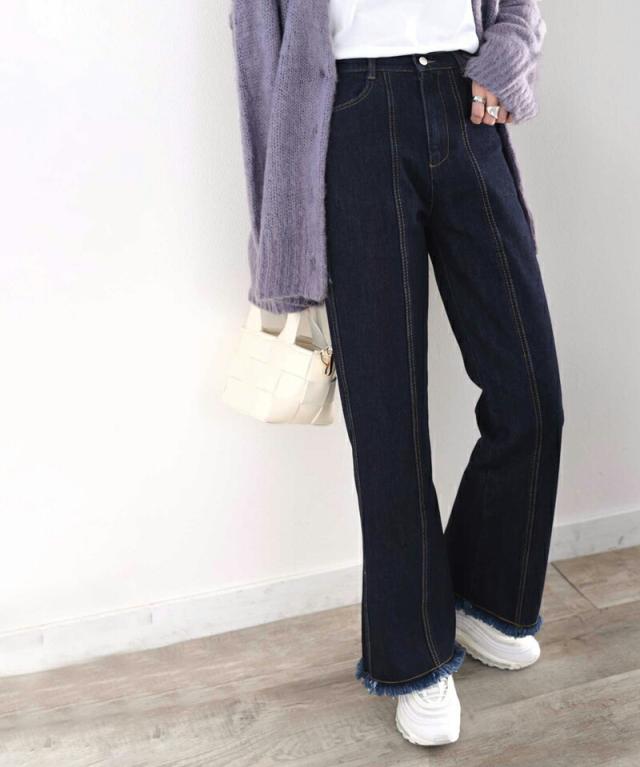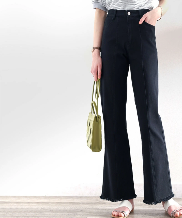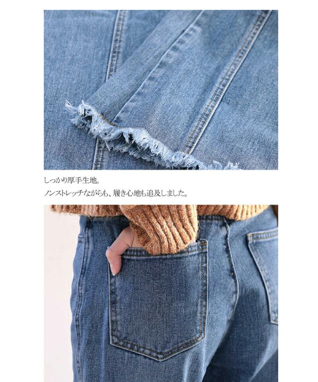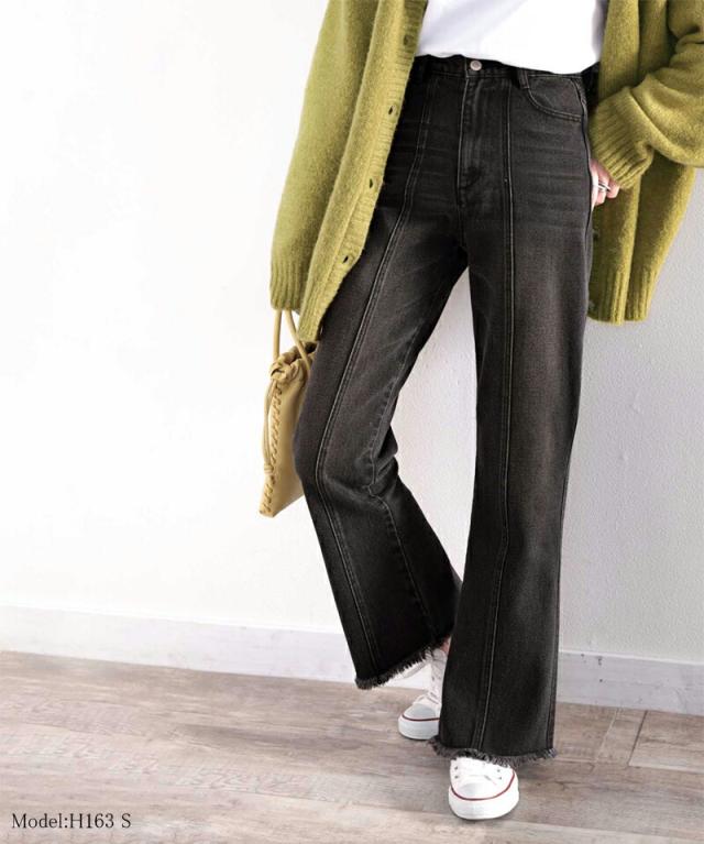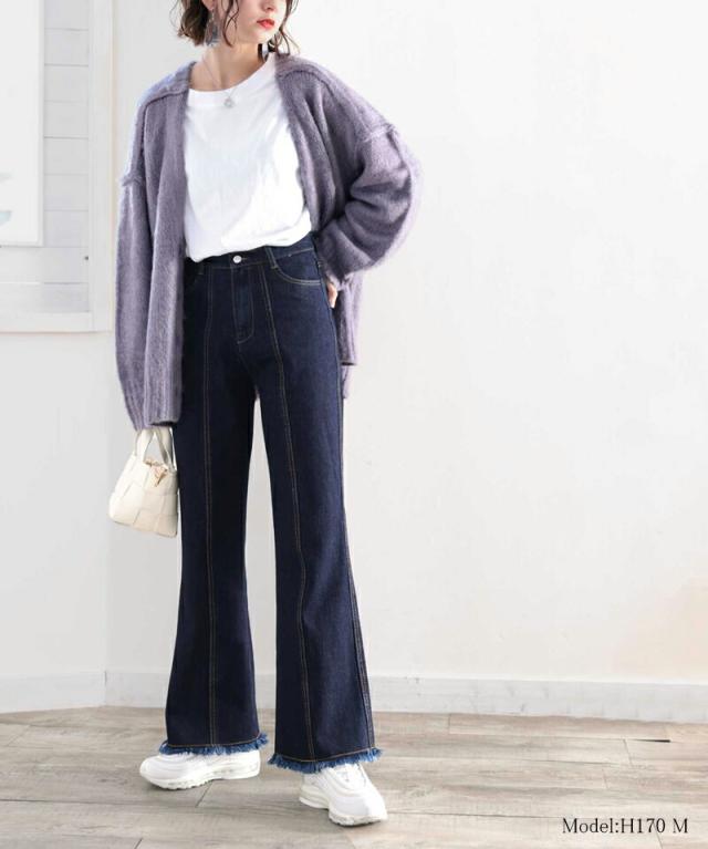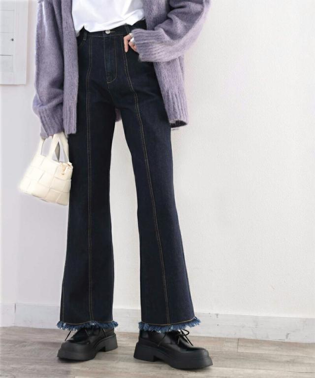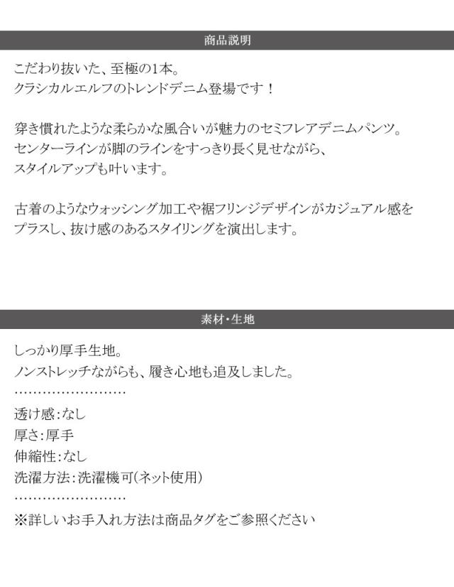 秋新作 クラシカルエルフ レディース 体型カバー ウエストゴム UV ボトムス デニムパンツ 裾フリンジ セミフレア 美脚 ジーンズ 大きいサイズ 小さいサイズ ce0900004