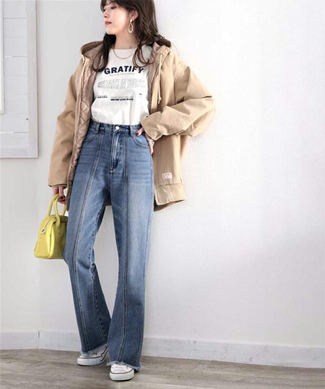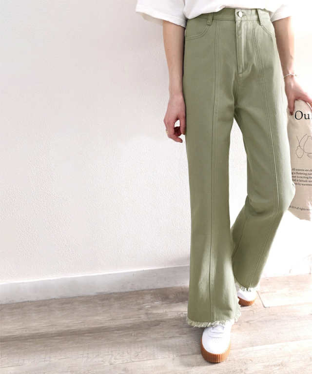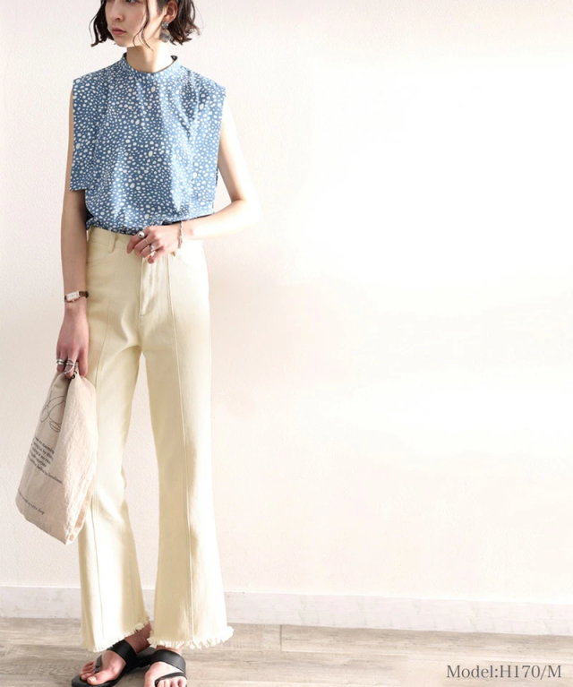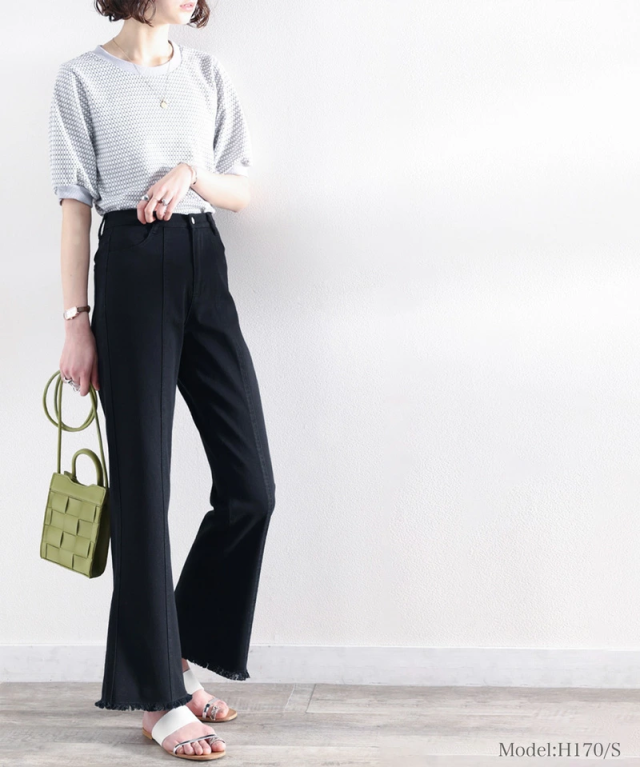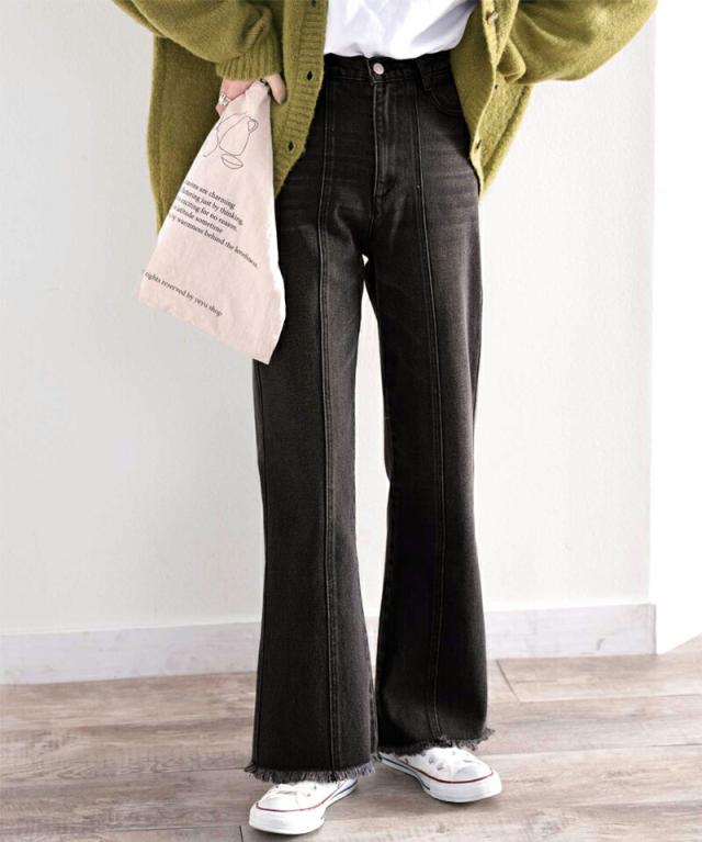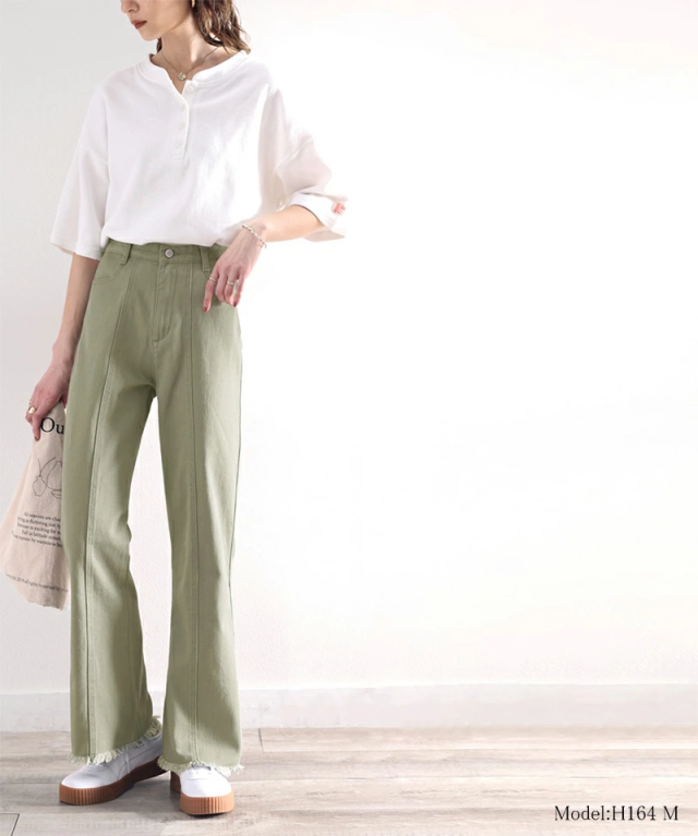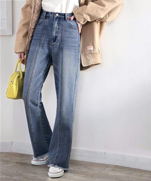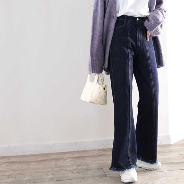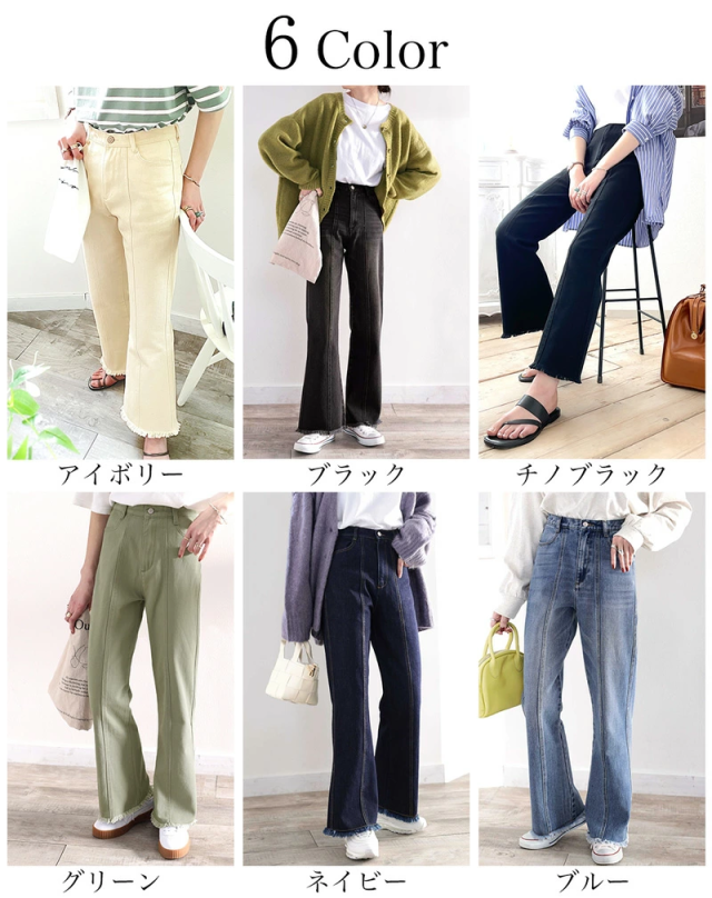 秋新作 クラシカルエルフ レディース 体型カバー ウエストゴム UV ボトムス デニムパンツ 裾フリンジ セミフレア 美脚 ジーンズ 大きいサイズ 小さいサイズ ce0900004