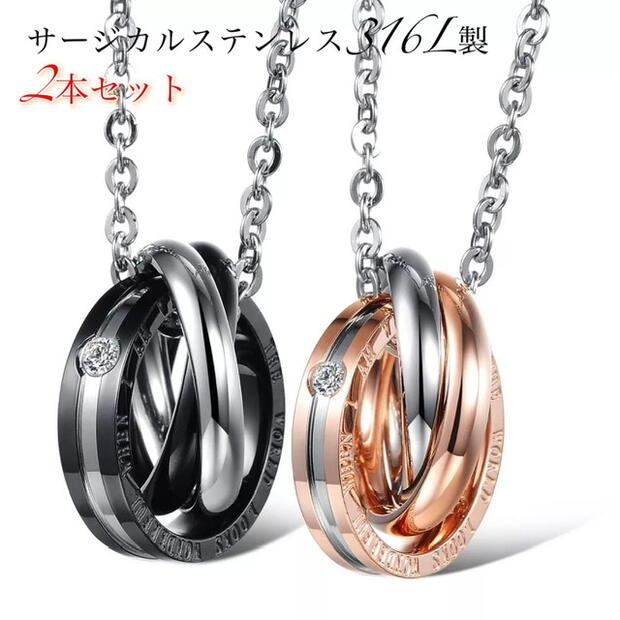 ペアネックレス2本セット サージカルステンレスネックレス ペア 金属アレルギー 3連リングネックレス お揃いカップル ステンレスネックレスチェーン ジルコニア ピンクゴールド シルバー ブラック 黒色 おそろい メンズ レディース リング カジュアル プレゼント クリスマス