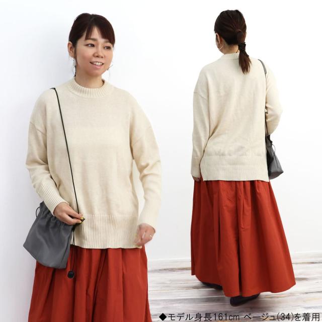 | 【着用サイズ感について】 ◆スタッフHITOMI (身長163cm 普段S〜Mサイズ着用) 身幅に程よくゆとりがあり、窮屈感が一切なく、首周りのチクチク感も無いです。 軽い着心地で肌触りの良いニットです。 ◆スタッフMie【身長161cm/普段SS〜Sを着用】 コットン100%で柔らかい着心地です。 厚地ではないのでシャツを内に入れたり、ワンピースの上に合わせたりと、 レイヤードでの合わせで着てあげても可愛いです。 裾がリブになっており再度はスリットが入っていてスッキリとしたウエストの印象になります。 また、スカートで合わせても丈感が丁度良かったです。 |