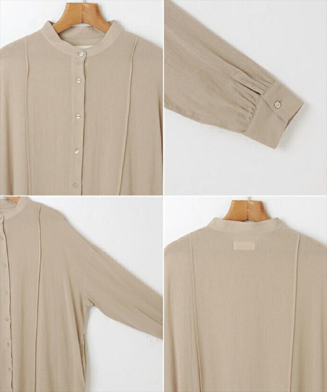 トレンド感のあるバンドカラー。ボタンはこだわりのシェルボタンを採用。