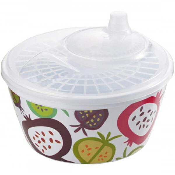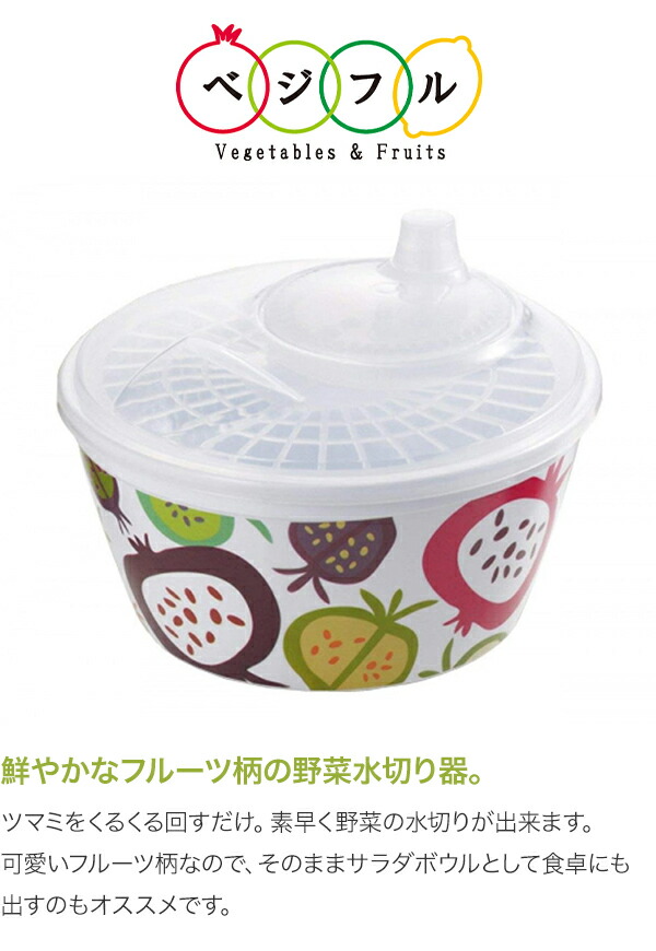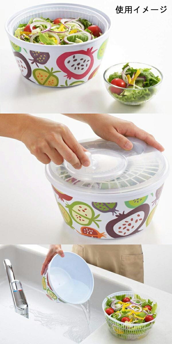 ツマミをくるくる回すだけ。素早く野菜の水切りが出来ます。可愛いフルーツ柄なので、そのままサラダボウルとして食卓にも出すのもオススメです。