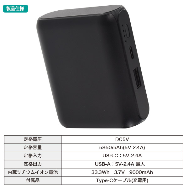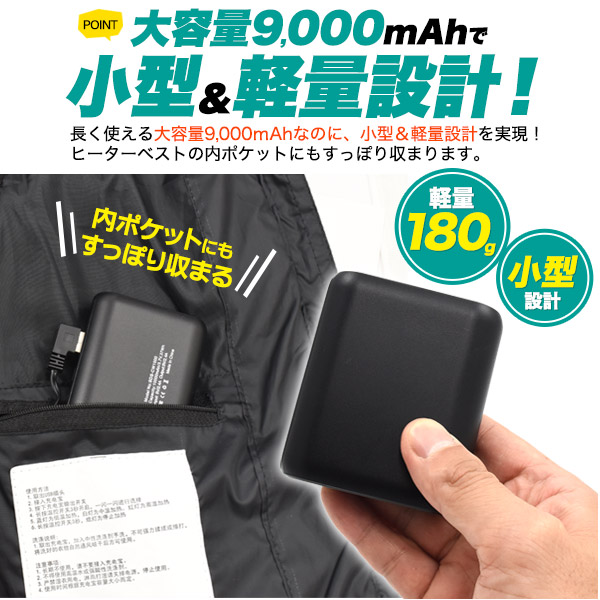 大容量+小型設計でヒータージャケットやネッククーラー、ファン付き作業服に最適な9000mAhモバイルバッテリー。