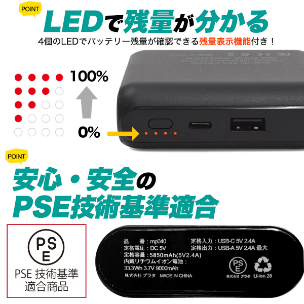 容量(内蔵リチウムイオン容量) :9000mAh 33.3Wh 3.7V