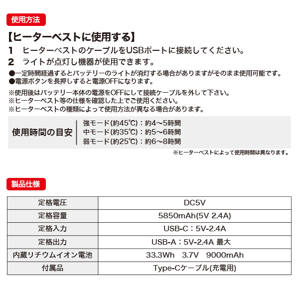 ※ヒーターベストの種類によっては使用できない場合があります。