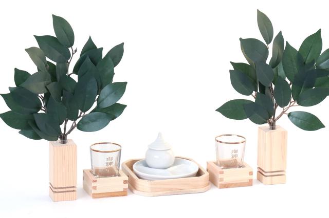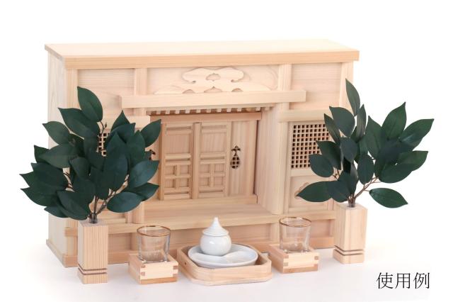 ・巴柄 三つ盛り陶器 水玉1.5寸付き (水・米・塩) / 直径10 高さ2 (水玉込み7) ・御神前 金文字入りコップ(小) / 高さ6.3 直径5 ・升 (お神酒)/ 高さ2.9 幅5.6 奥行5.6 ・桧製 折敷4寸 / 高さ2.3 幅12 奥行12 ・桧製 榊立て(中) / 高さ9.0 幅3.5 奥行3.5 ・シルク調造花榊一対 |