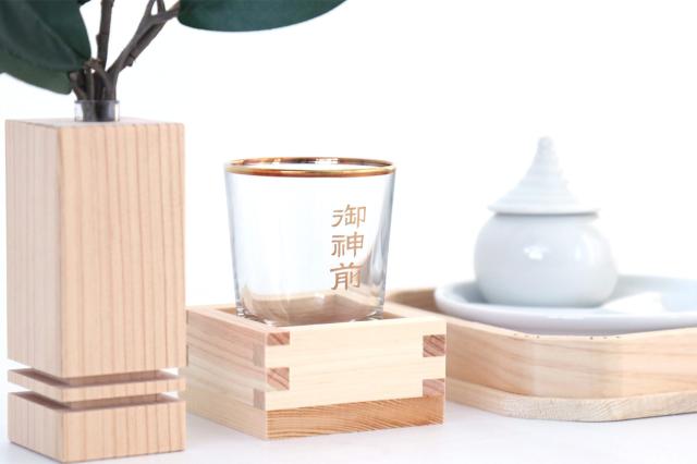 謹んで過ごす、神前のひととき。お神酒はマス酒で丁寧に、お水・お米・お塩は丸い陶器に一緒に盛って、折敷でお供えします。モダン神棚のほか、横幅50〜60センチ程度の中型「三社」「箱宮」などに適したサイズ感とデザイン。神棚に上質な神具を一式そえて、一層華やかにお祀りを。