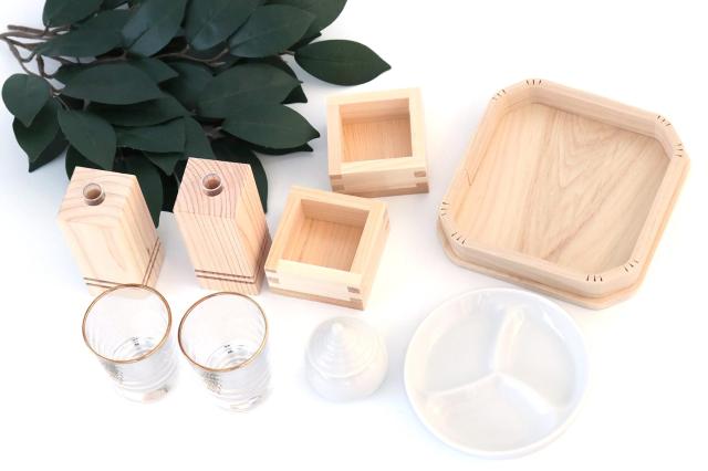 謹んで過ごす、神前のひととき。 お神酒はマス酒で丁寧に、お水・お米・お塩は丸い陶器に一緒に盛って、折敷でお供えします。モダン神棚のほか、横幅50〜60センチ程度の中型「三社」「箱宮」などに適したサイズ感とデザイン。神棚に上質な神具を一式そえて、一層華やかにお祀りを。 |