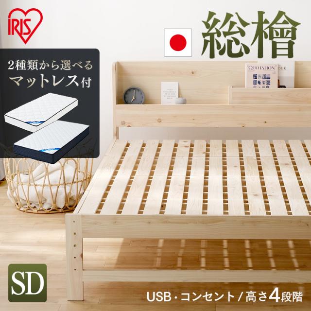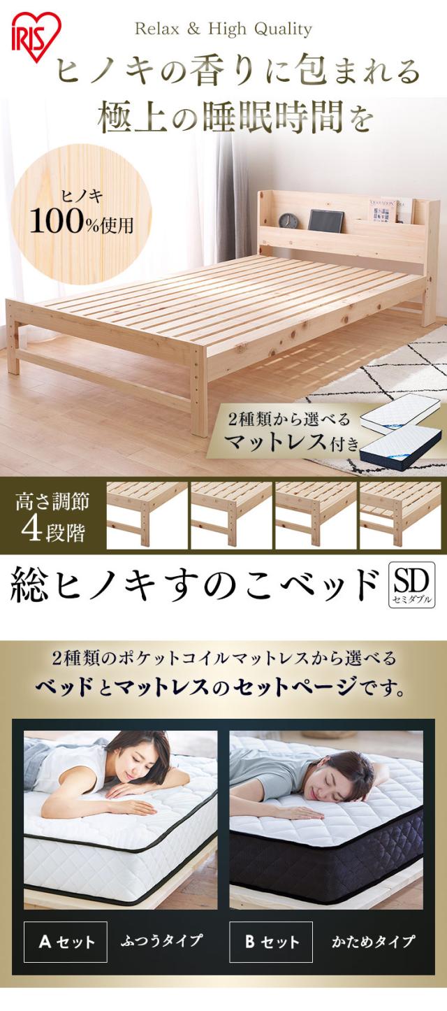 ベッド セミダブル マットレスセット ポケットコイル ポケットコイルマットレスセット すのこベッド ひのき 檜 総ヒノキすのこベッドマットレスセット セミダブル20cm かため21cm 全2マットレス スノコ ヒノキ 安眠 コイルマットレス アイリスオーヤマ