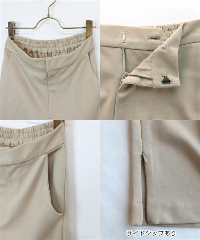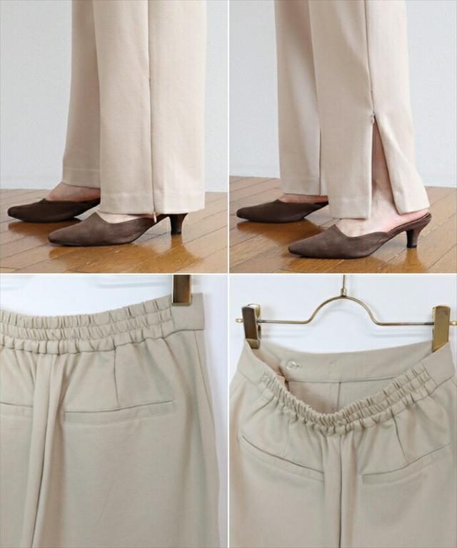 伸縮性があり、滑らかな手触りが心地よく、シーズン問わず着られる素材感にこだわりました。ヒップ〜太ももまわりにゆとりがあり、全体的に少しゆるっとしたシルエット。ワイドすぎず、細すぎず、程よく仕上げた絶妙なバランスがデザイナーのこだわりポイトです。サイドジップはお好みで開閉できる2way仕様。ジップを閉めた状態では無難なオフィスパンツとして、ジップを外せばトレンド感のあるプライベート服に♪ウエスト後部はたっぷりのゴムシャーリングでとにかく楽ちんに♪