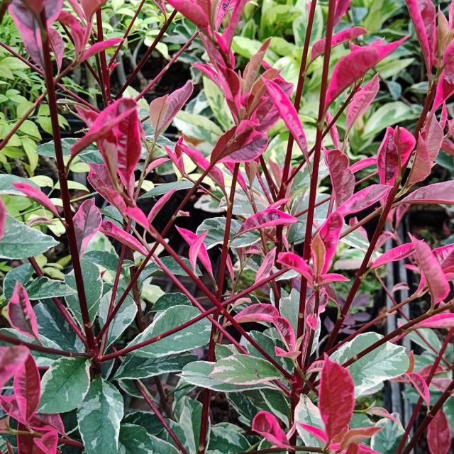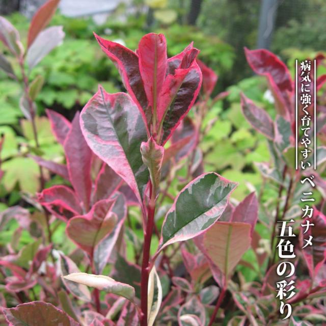 フクリン斑が入った葉が五色に変化する美しいベニカナメです。病気に強い品種なので、育てやすく初心者向けの品種です。