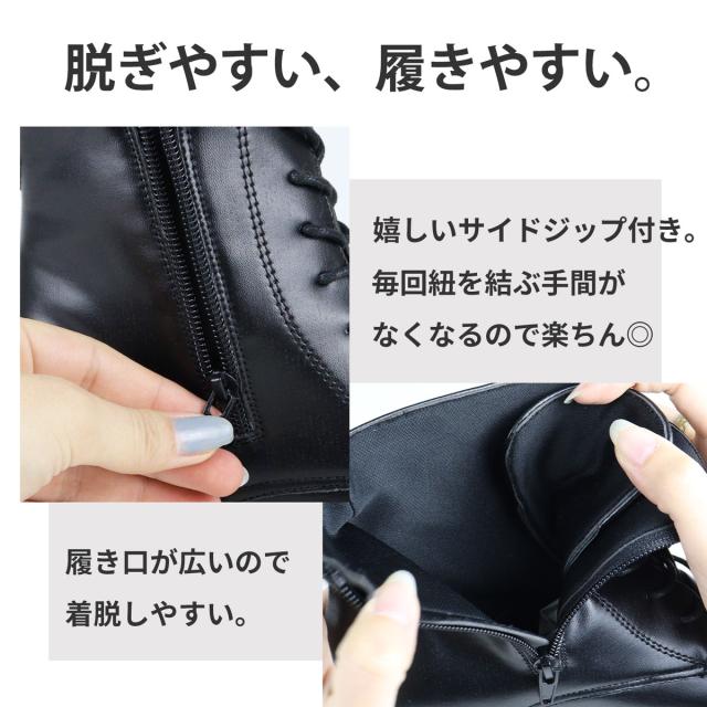 サイドジップが付いているので、靴紐を結ぶ手間が省けて脱ぎ履きがスムーズです。