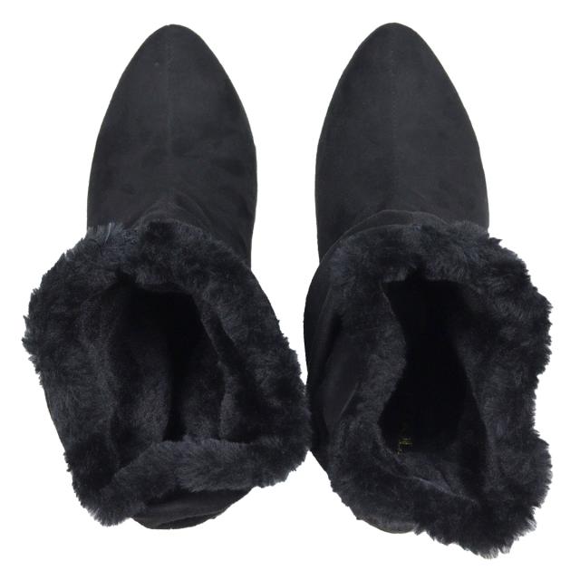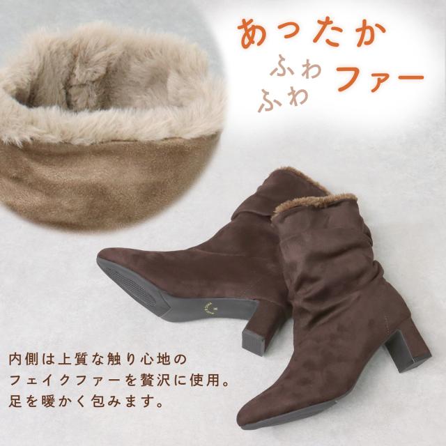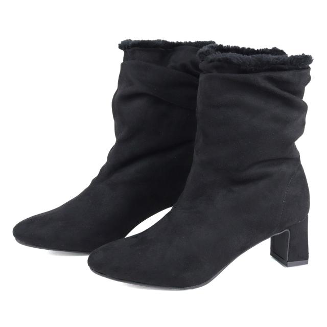 ブーツ ショートブーツ ミドリブーツ レディース 靴 厚底 5.5cmヒール 軽量 ファー スエード ポインテッドトゥ 太ヒール ドレープ 防寒 美脚 脚長効果 22.5cm〜24.5cm 黒 ブラック LiBERTYDOLL リバティードール No.9077