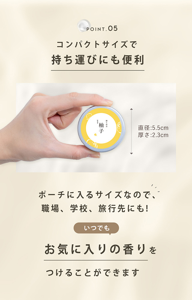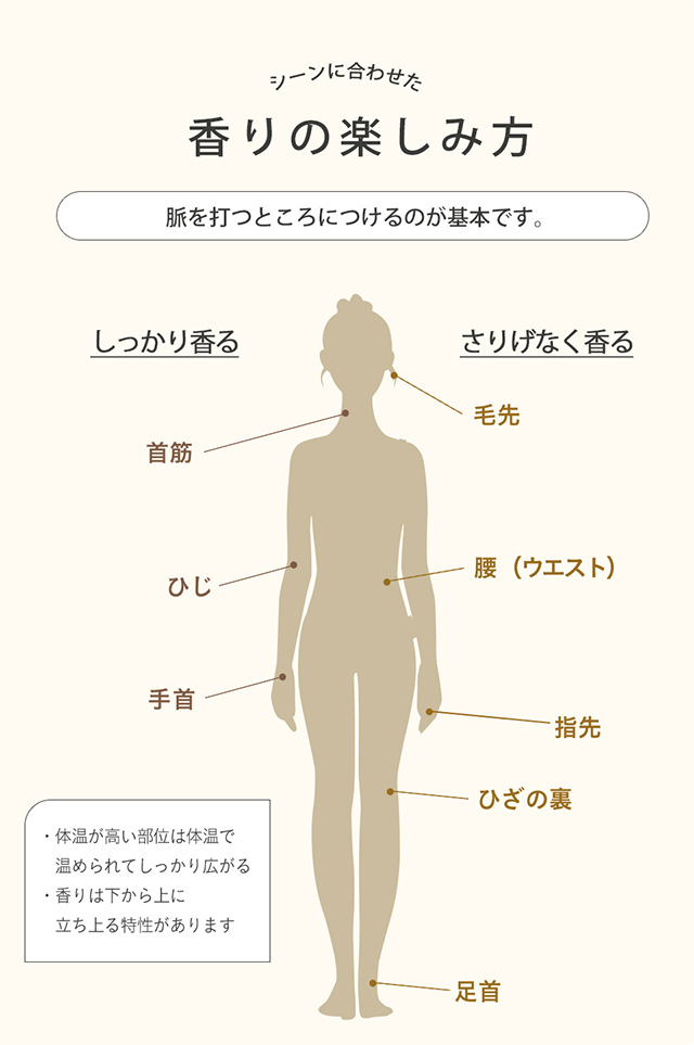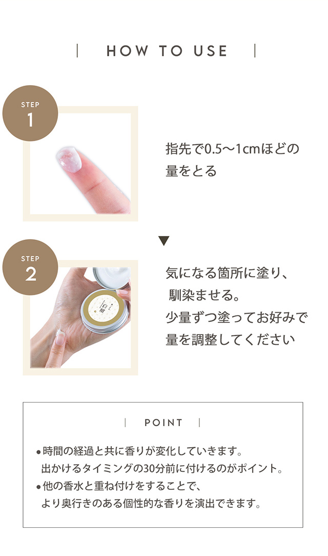 | 使用方法 | 適量を手に取り首や手首になじませてください。 |