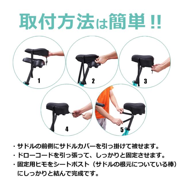 (1)サドルの前側にサドルカバーを引っ掛けて被せます。