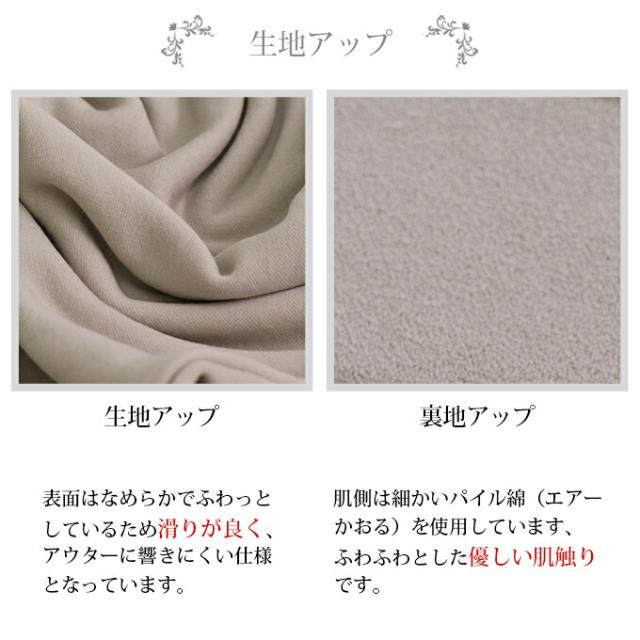 肌側は細かいパイル綿(エアーかおる)を使用しています、ふわふわとした優しい肌触りです。前ぐりが深いため、インナーの上からさらにインナーを重ね着してもアウターに響きにくいです。