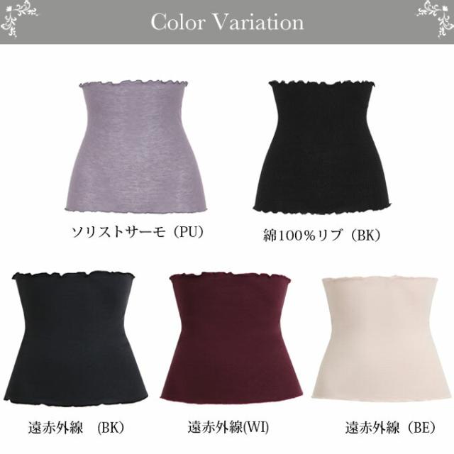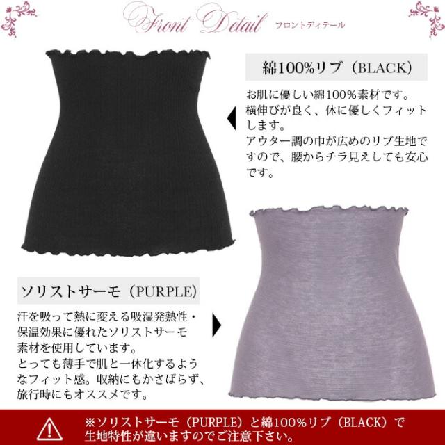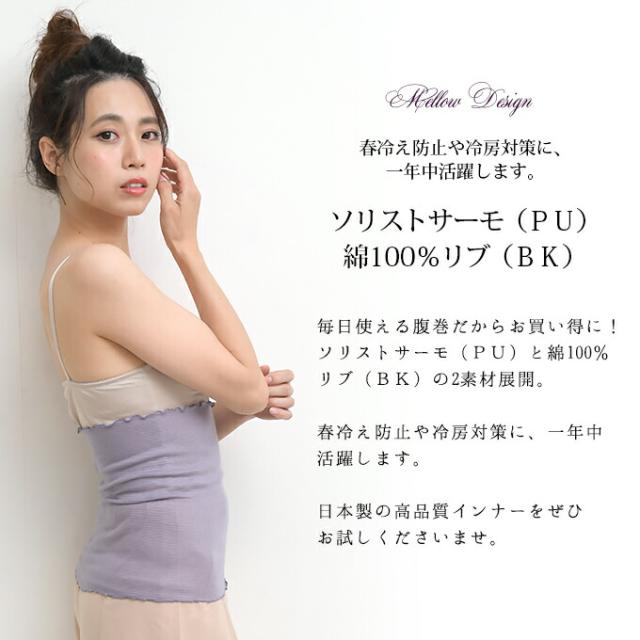 毎日使える腹巻だからお買い得に!ソリストサーモ(PU)と綿100%リブ(BK)の2素材展開。春冷え防止や冷房対策に、一年中活躍します。