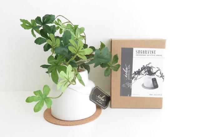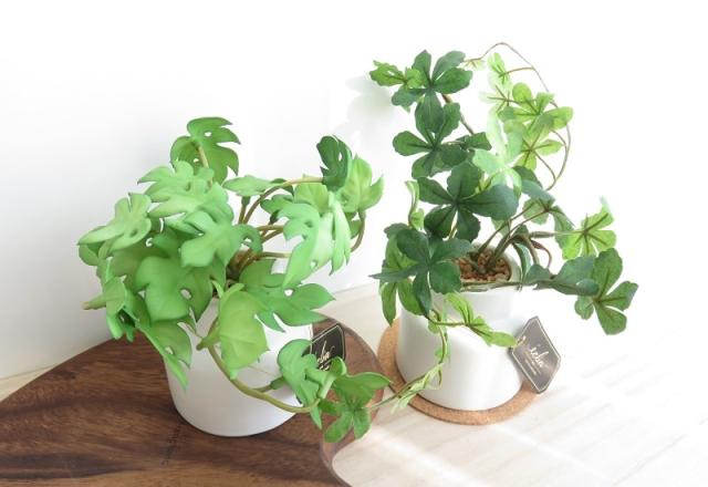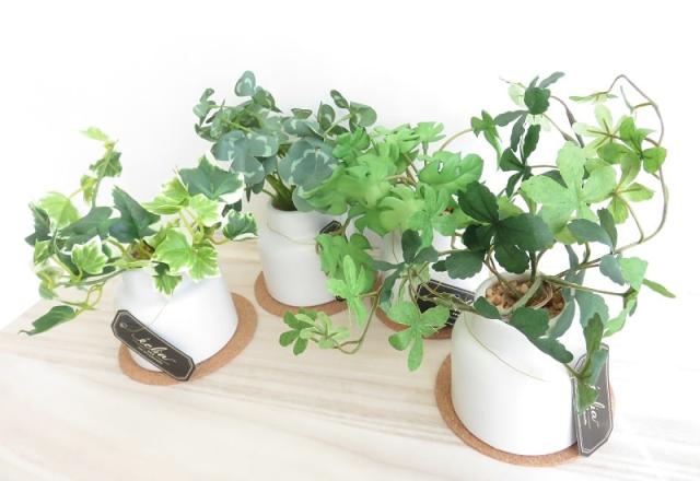 定番のクローバーに、白い斑入りの愛らしい葉の形で人気のアイビー、切れ込みが入った独特な葉が特徴的なモンステラ、爽やかな常緑つる性植物のシュガーバインをラインナップ。